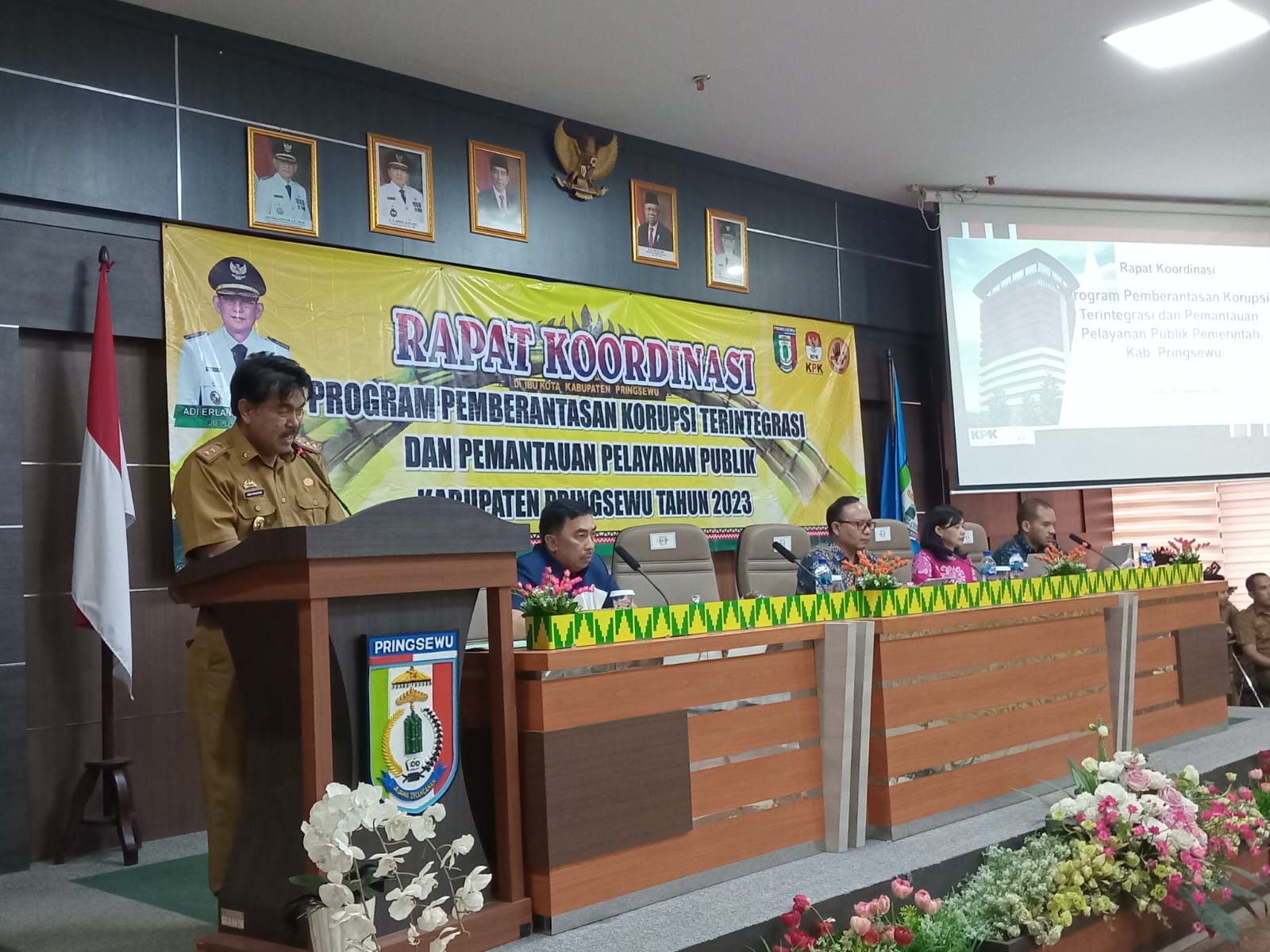Hal tersebut diungkapkan Sekretaris Daerah Kabupaten Pringsewu Heri Iswahyudi, mewakili Penjabat Bupati Pringsewu Adi Erlansyah pada Rapat Koordinasi Program Pemberantasan Korupsi Terintegrasi dan Pemantauan Pelayanan Publik Kabupaten Pringsewu bersama KPK RI di Aula Utama Kantor Pemkab Pringsewu, Komplek Perkantoran Pemkab Pringsewu, Pekon Klaten, Kecamatan Gadingrejo, Pringsewu, Selasa (26/9/2023).
