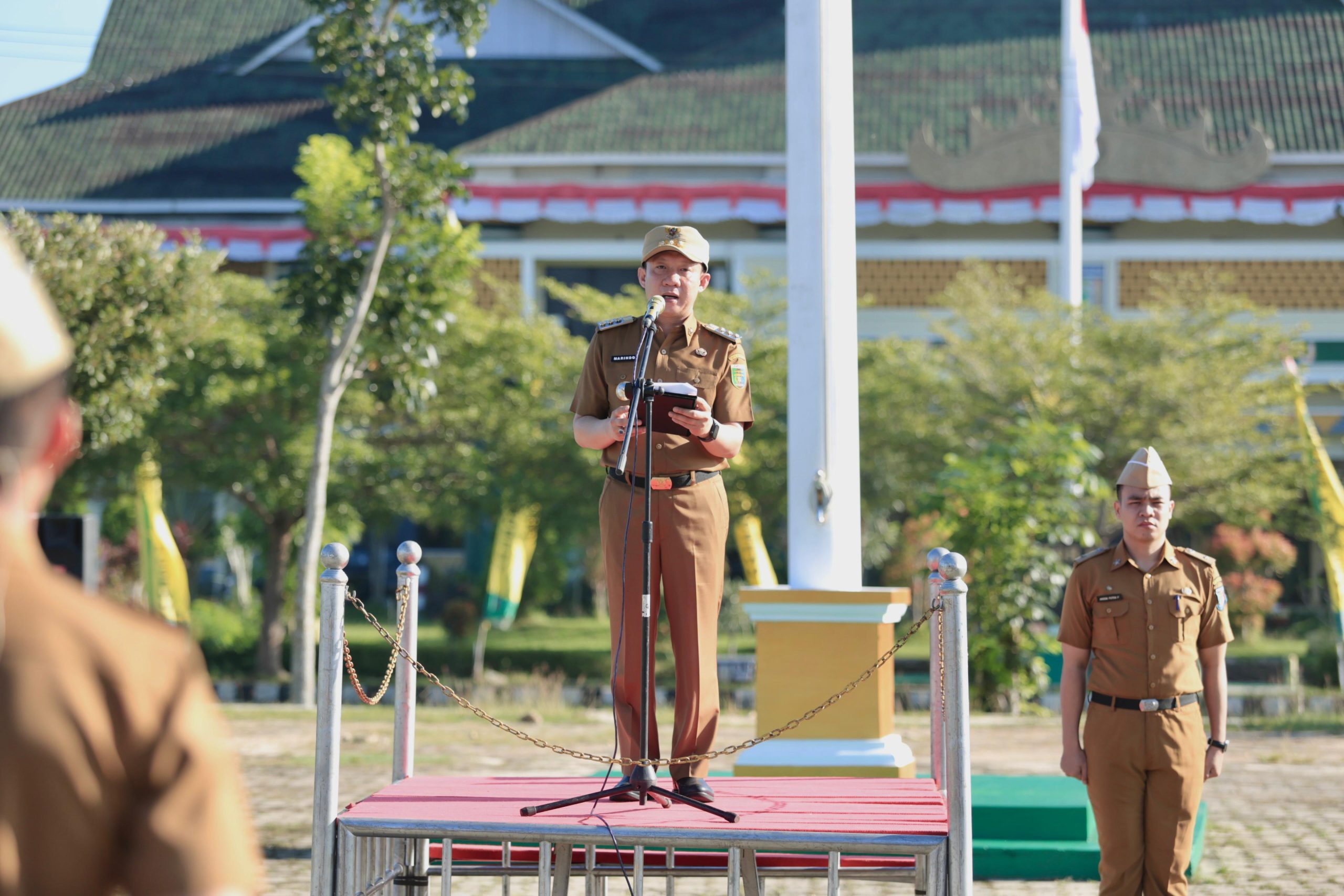 Penjabat (Pj) Bupati Pringsewu Marindo Kurniawan yang bertindak sebagai pembina apel, menyampaikan ucapan terima kasih, dan apresiasi kepada seluruh jajaran atas dukungannya terhadap program pembangunan.