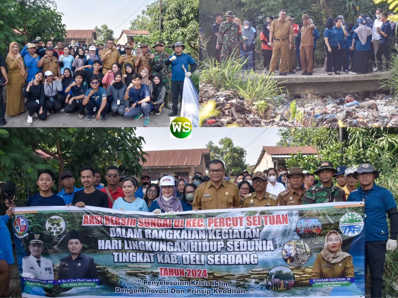 Dinas Lingkungan Hidup Kabupaten Deliserdang berkolaborasi dengan Dinas Kesehatan (Dinkes) Deliserdang dan segenap unsur desa melakukan aksi bersih sungai di Kecamatan Percut Sei Tuan, Selasa (23/7). Aksi bersih sungai itu dilaksanakan dalam rangka Hari Lingkungan Hidup Sedunia Tingkat Kabupaten Deliserdang.
