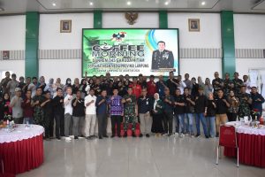 Coffee Morning Danrem 043/Gatam bersama Insan Media Provinsi Lampung juga dihadiri Wakil Ketua PWI Lampung Bidang Kerjasama Bapak Sony Eriko, Kepala Stasiun LPP RRI Bandar Lampung Iwan Effendi Lathan, S.Sos., M.M., Kepala LPP TVRI Stasiun Lampung Muhammad Ikhsan, S.T., M.T., Pimpinan Tribun Lampung Erniwaty Madjaga, Kasrem 043/Gatam Kolonel Inf Enjang, S.I.P., M.Han., Kasiren Korem 043/Gatam, Para Kasi Kasrem 043/Gatam, Para Pimred Media Elektronik, Cetak dan Media Online.
