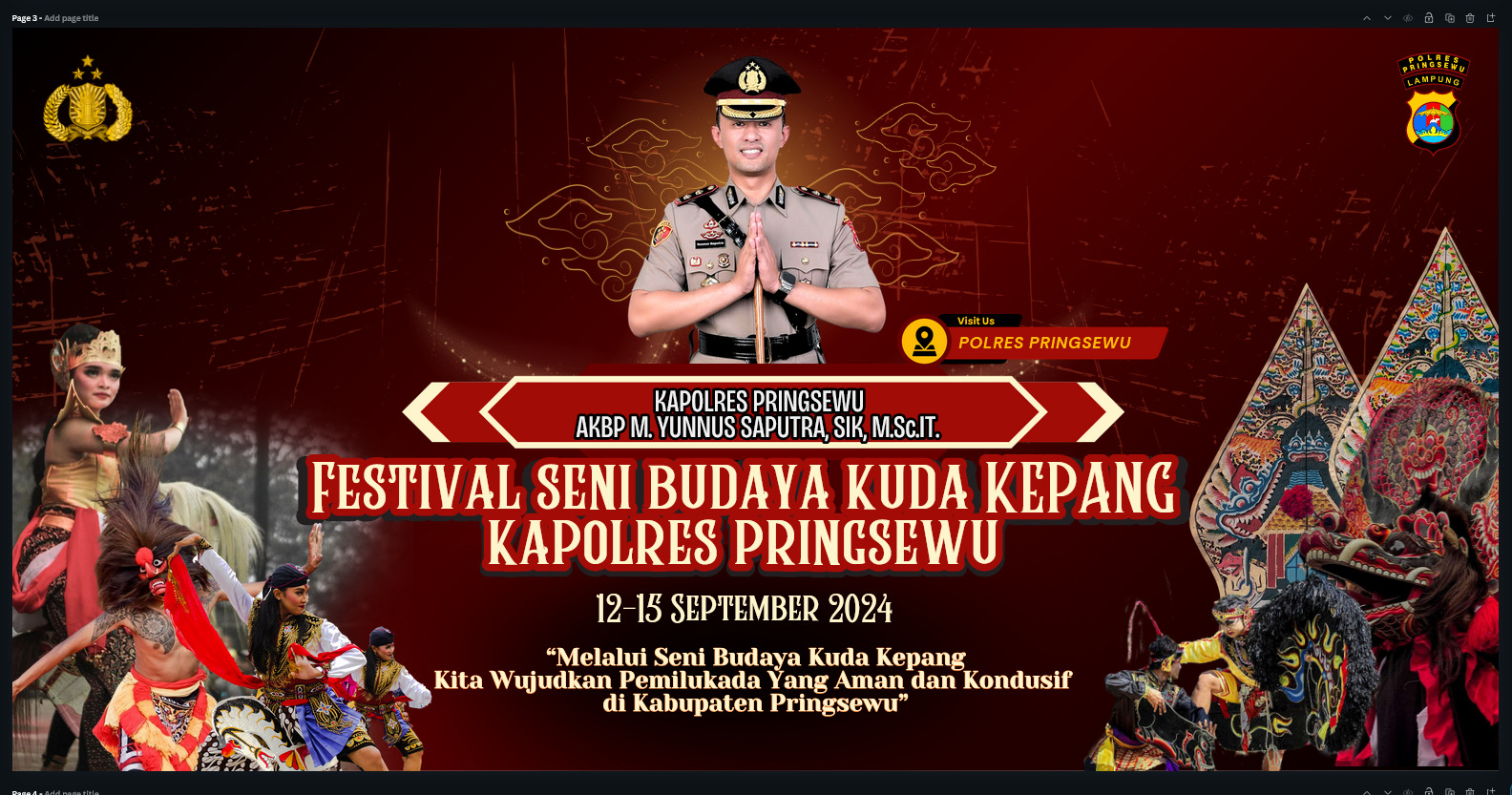Pringsewu (ungkapkasus.id)- Polres Pringsewu Polda Lampung mengumumkan akan menggelar Festival Seni Budaya Kuda Kepang selama empat hari berturut-turut, mulai tanggal 12 hingga 15 September 2024. Kegiatan ini disampaikan oleh Kapolres Pringsewu, AKBP M. Yunnus Saputra, saat ditemui oleh awak media di Mapolres Pringsewu pada Rabu (4/9/2024).
