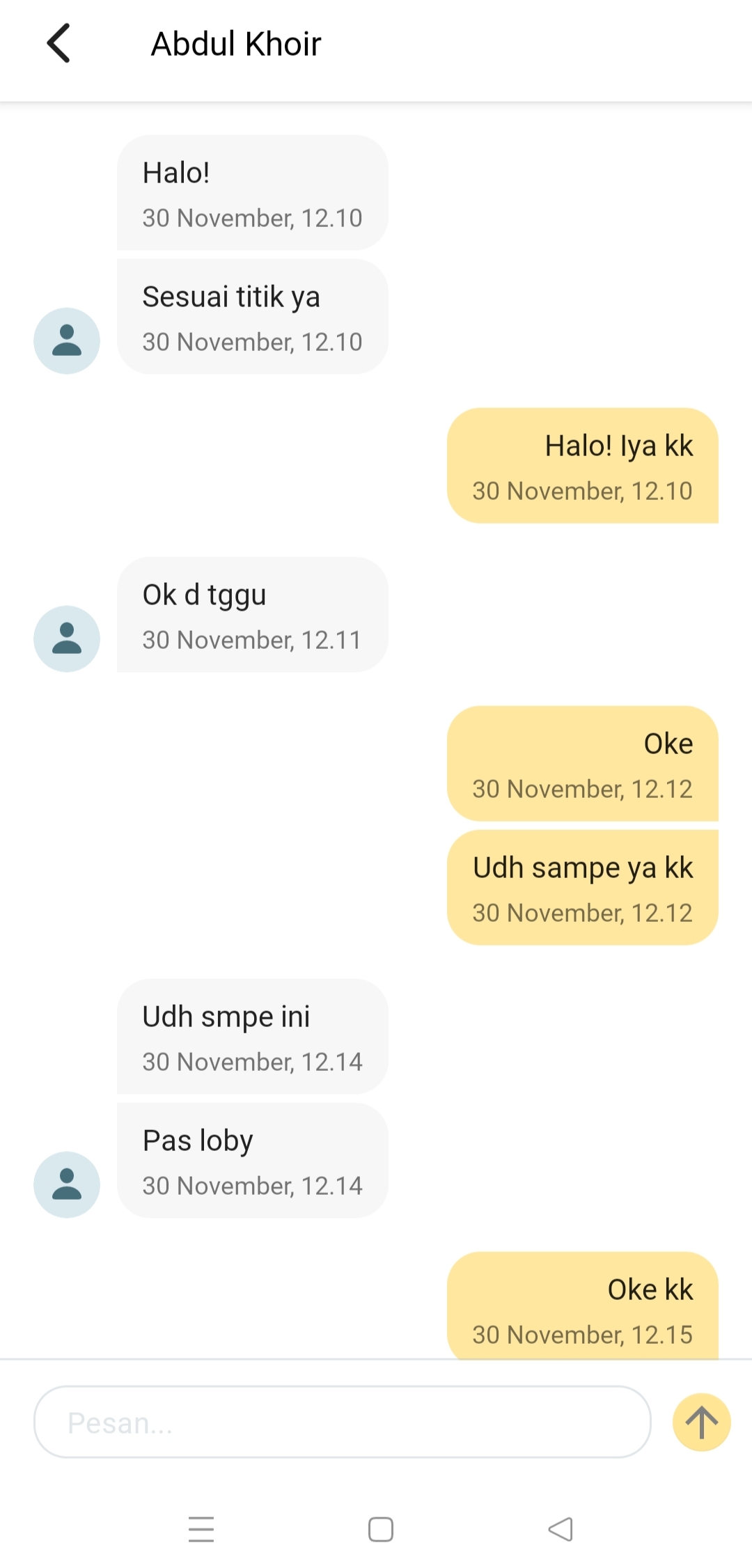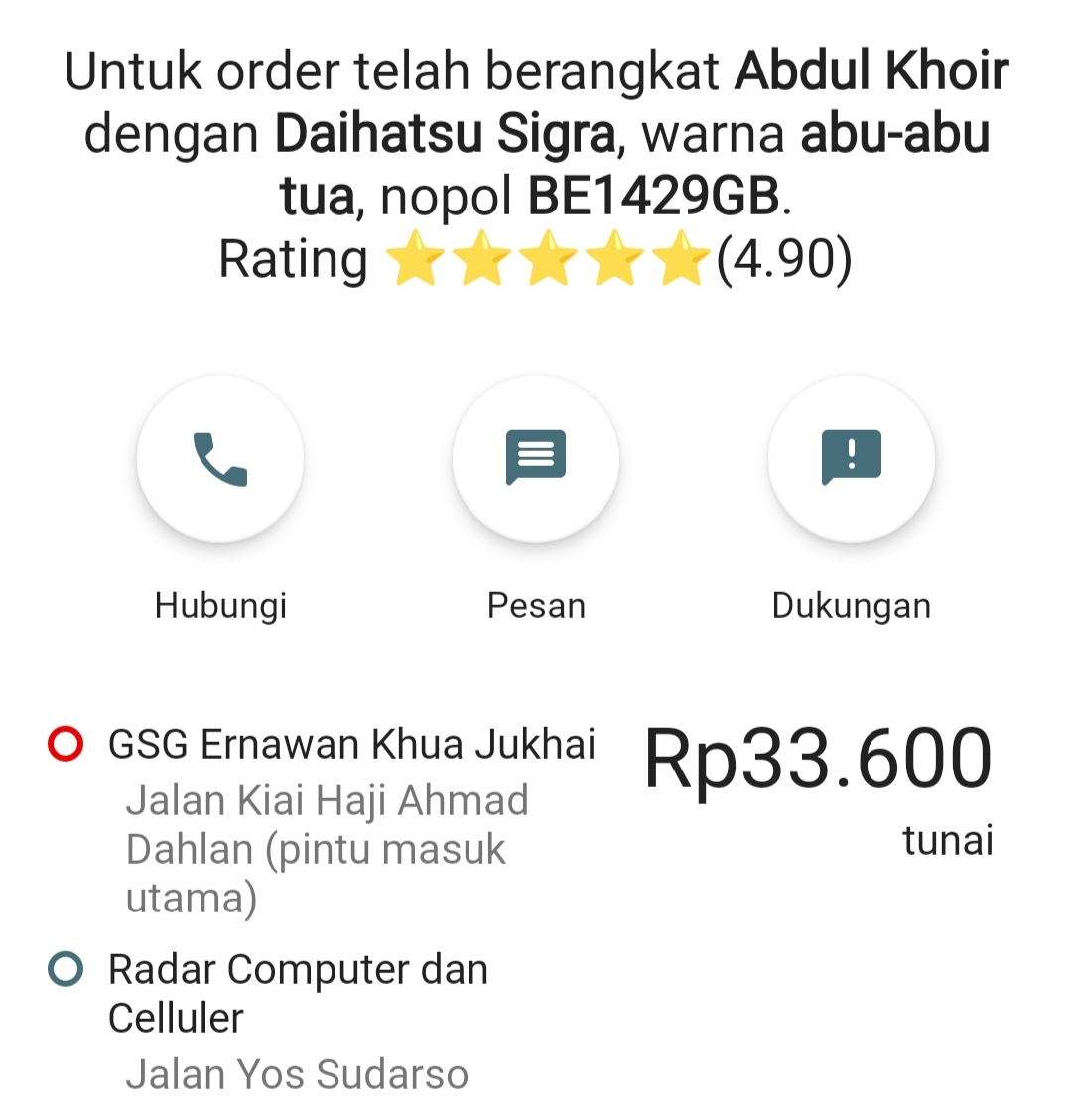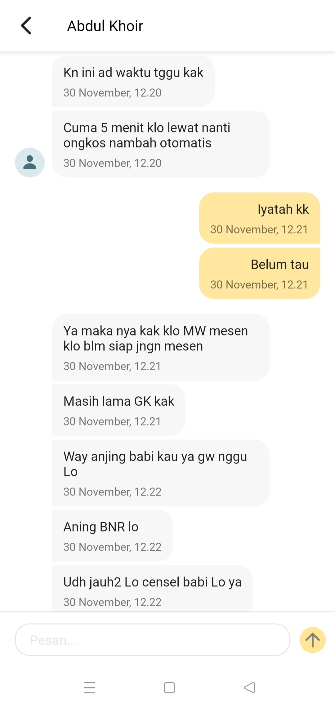 “Ketika saya bilang tunggu sebentar, dia malah ngomel lewat chat. Katanya, ‘Ya, makanya kak kalau belum siap jangan pesan.’ Bahkan, dia bertanya lagi, ‘Masih lama nggak, kak?’,” kata Abdul Khoir.