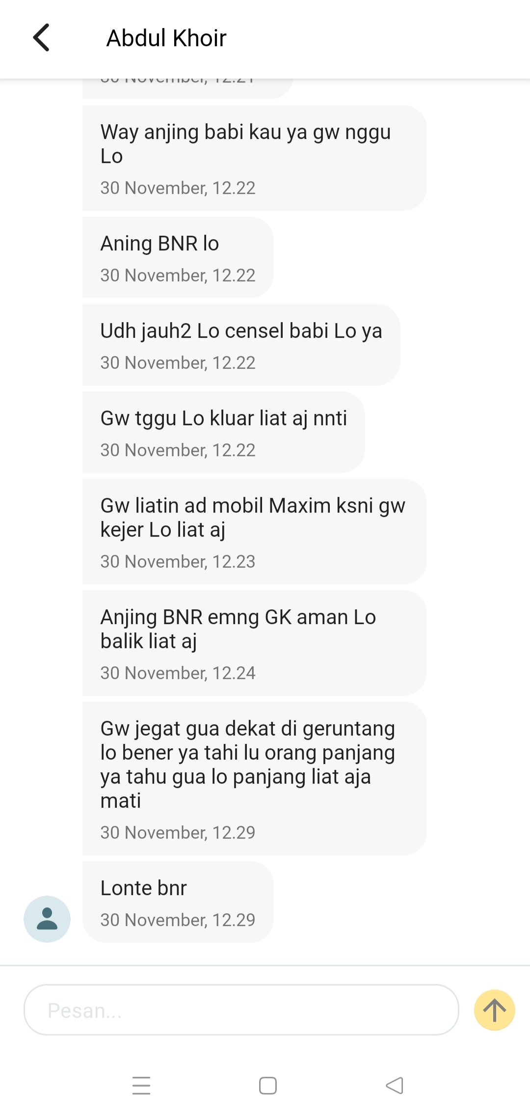 Tidak berhenti di situ, ancaman lain yang lebih mengerikan juga dikirimkan. “Gua jegat di deket Garuntang. Lo bener ya tai. Liat aja mati. Lonte bener,” tambahnya.