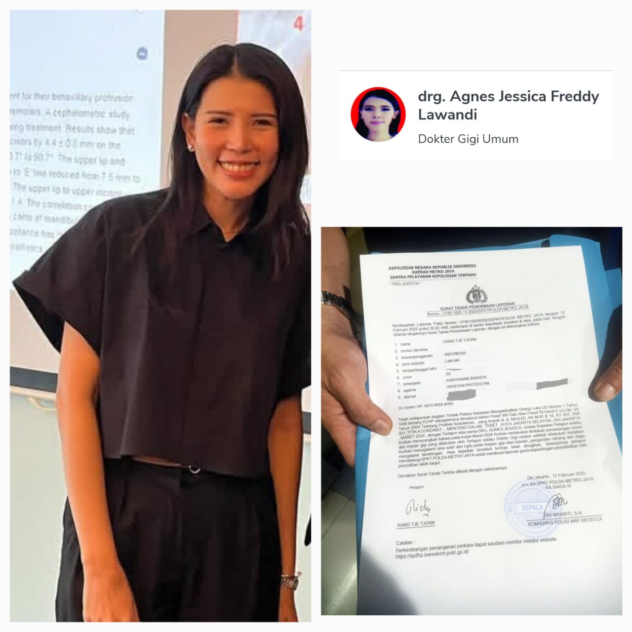Setelah melapor ke Majelis Disiplin Profesi dugaan malpraktek drg Agnes Jessica, korban Kang Tje Tjoan (53) alias Riki melaporkan dokter gigi tersebut ke Polda Metro Jaya, Selasa 12 Februari 2024.