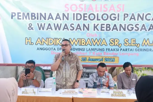 Bandar Lampung – Ungkap Kasus / Menjaga dan merawat Pancasila merupakan kewajiban setiap warga negara Indonesia, bukan hanya tugas aparat pemerintah. Hal ini disampaikan Anggota DPRD Provinsi Lampung, Andika Wibawa, saat melaksanakan sosialisasi Pembinaan Ideologi Pancasila dan Wawasan Kebangsaan di Sukadanaham, Tanjung Karang Barat, pada Sabtu (25/1).