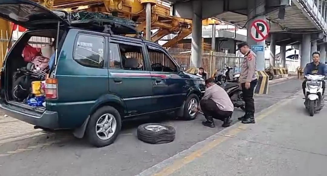 Lalu, Kamis (27/3/2025) pagi tadi, anggota KSKP Bakauheni Bripka Fami membantu pemudik mengendarai mobil yang mengalami pecah ban.