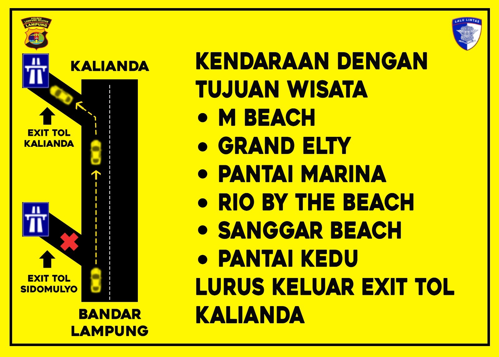 Kasat Lantas Polres Lampung Selatan, AKP R Manggala Agung SM , menjelaskan, “Sistem one way ini diberlakukan mulai dari jalur Tol menuju Objek Wisata Kalianda, termasuk M Beach, Elty, Pantai Marina, dan RIO By The Beach.”