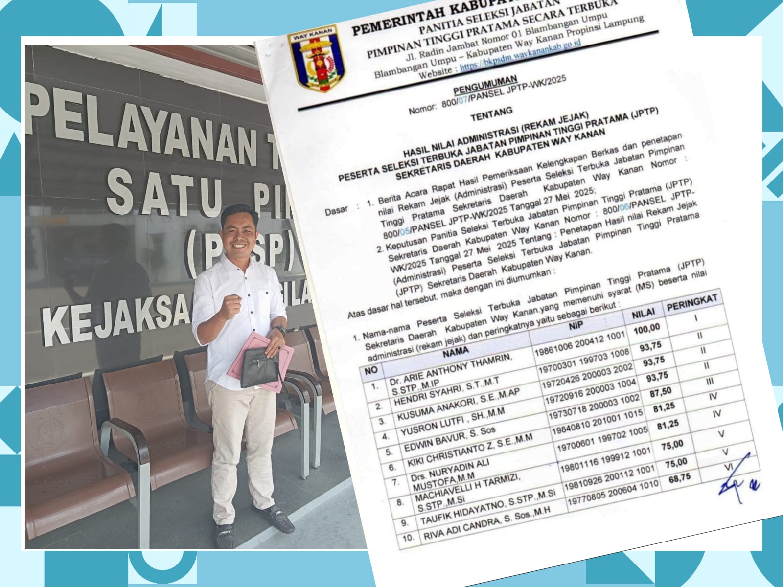 Nama Dr. Arie Anthony Thamrin, S.STP., M.IP, muncul sebagai peserta dengan nilai sempurna 100 dan peringkat pertama. Namun, publik terkejut saat mengetahui bahwa Arie adalah sepupu kandung Bupati dan Ketua DPRD Way Kanan, yang juga bersaudara.