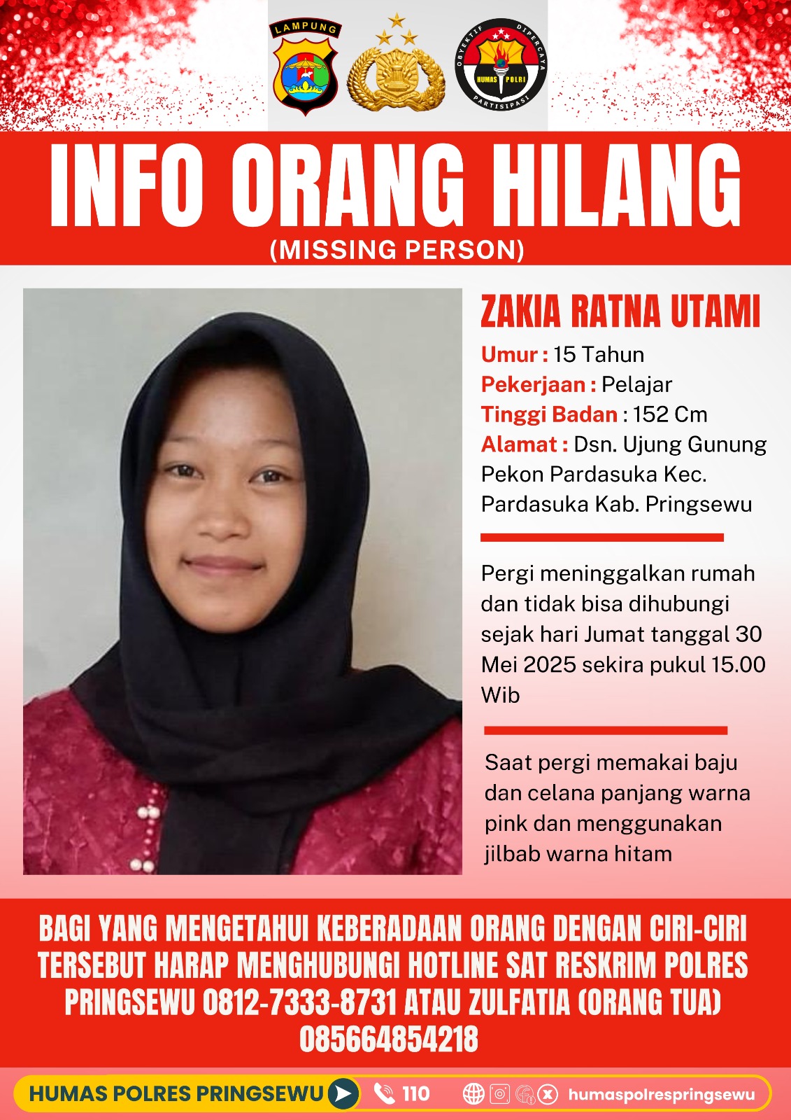Bagi masyarakat yang memiliki informasi mengenai keberadaan Zakia dapat menghubungi Hotline Sat Reskrim Polres Pringsewu di nomor 0812-7333-8731 atau langsung menghubungi pihak keluarga di nomor 0856-6485-4218.