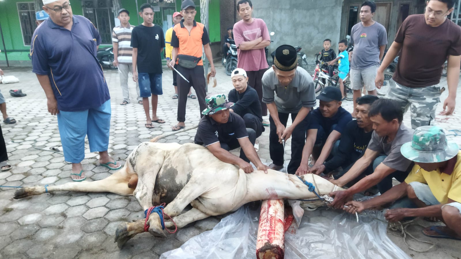 Pemotongan hewan qurban dilakukan secara serentak dan tertib di halaman masjid. Suasana gotong royong terasa kuat sejak persiapan hingga pendistribusian. Warga menyambut kegiatan ini dengan antusias dan mengaku sangat terbantu dengan pembagian daging yang adil dan merata.