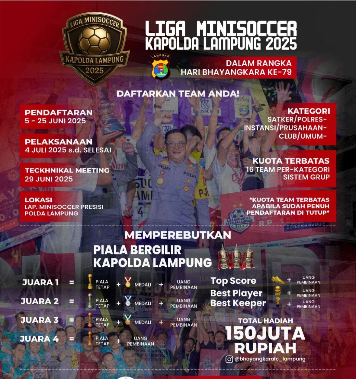 Lampung(ungkapkasaus.id) – Kepolisian Daerah Lampung akan segera menggelar turnamen Minisoccer Kapolda Cup 2025 yang dijadwalkan dibuka pada 4 Juli 2025 di Lapangan Presisi Polda Lampung.
