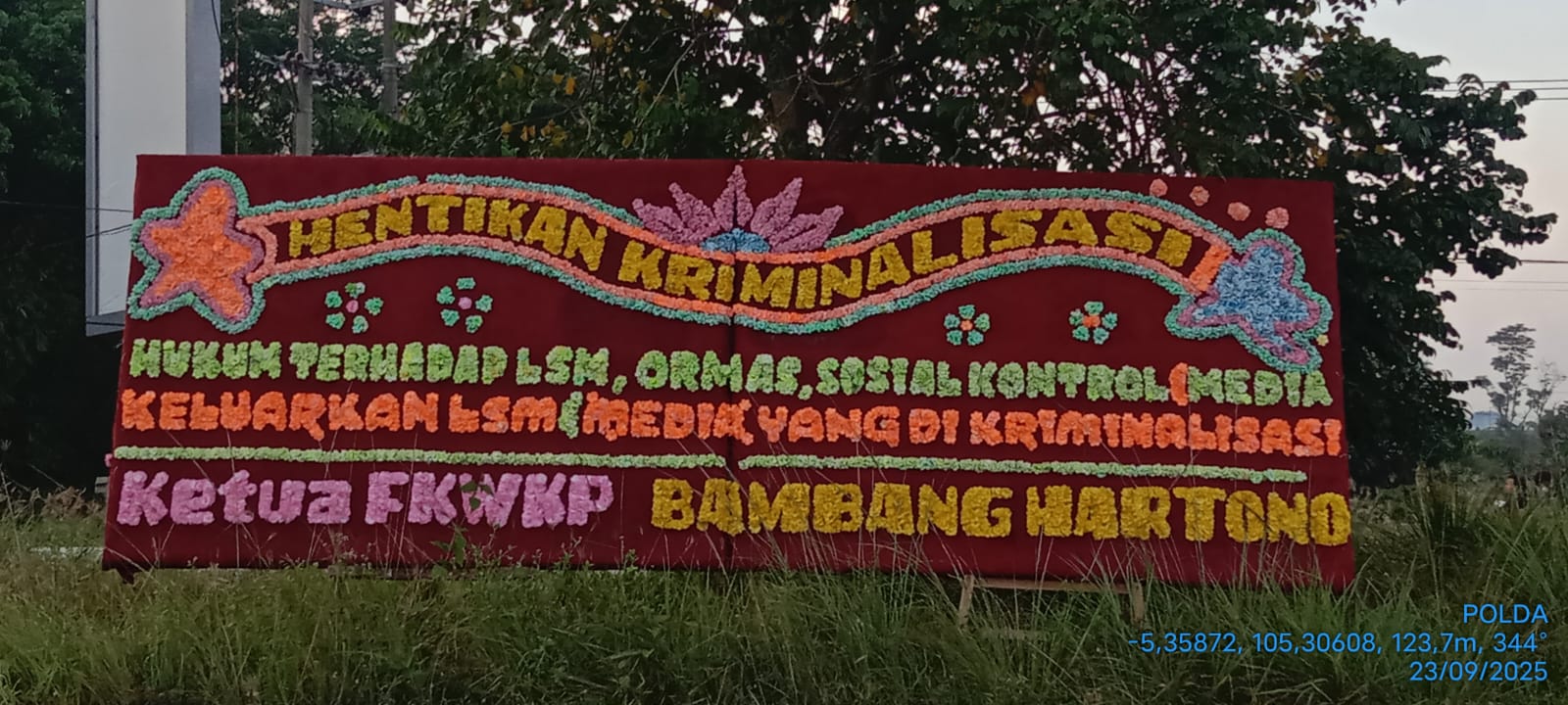 Karangan bunga ini datang dari berbagai lembaga swadaya masyarakat (LSM) dan organisasi media di Lampung, menyuarakan protes keras terhadap dugaan kriminalisasi yang menimpa aktivis dan jurnalis.