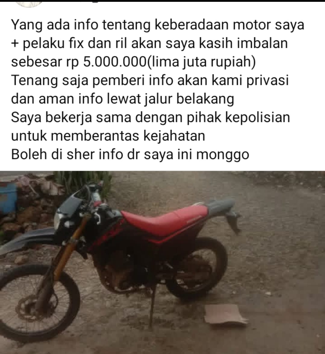 Sebagai upaya mencari motor kesayangannya, pemilik bahkan menyiapkan sayembara imbalan Rp5 juta bagi siapa pun yang memberikan informasi akurat terkait keberadaan motor tersebut.