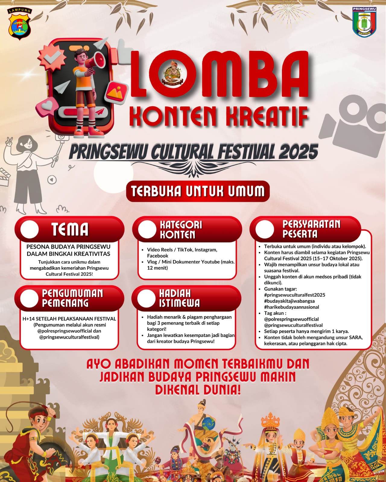 Lomba ini mengangkat tema “Pesona Budaya Pringsewu dalam Bingkai Kreativitas” dengan kategori video reels, TikTok, Instagram dan Facebook atau vlog mini dokumenter YouTube berdurasi maksimal 12 menit. Peserta wajib mengambil konten selama kegiatan Pringsewu Cultural Festival berlangsung pada 15–17 Oktober 2025.