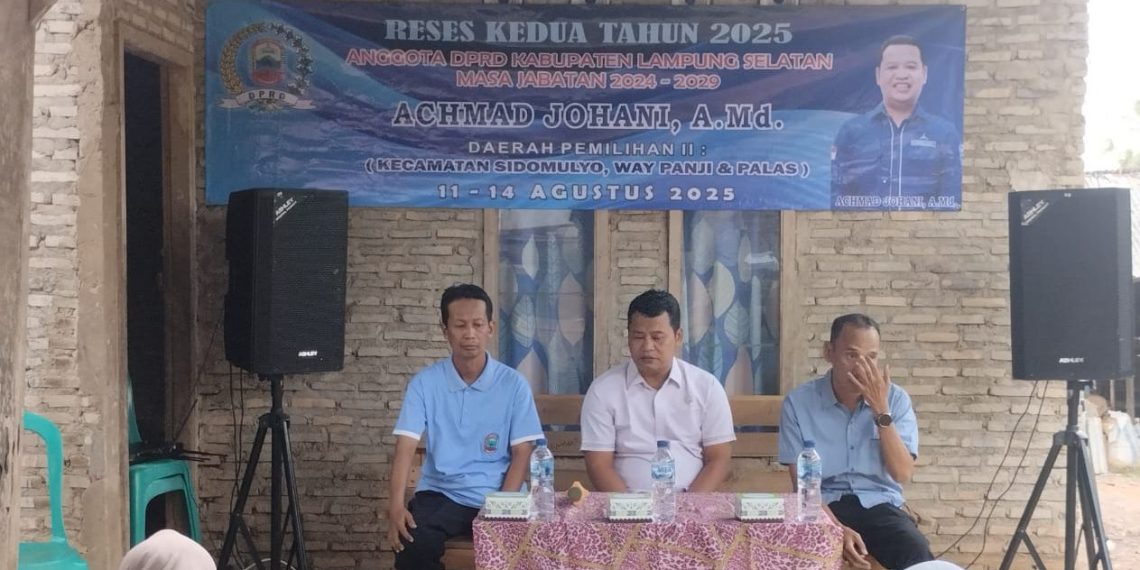 – Anggota DPRD Kabupaten Lampung Selatan dari Fraksi Demokrat, Achmad Johani, A.Md, menggelar reses kedua tahun 2025 di Dusun Way Pelus, Desa Seloretno, Kecamatan Sidomulyo, Rabu (13/8/2025). Kegiatan ini merupakan agenda rutin DPRD untuk menyerap aspirasi masyarakat di daerah pemilihan masing-masing.