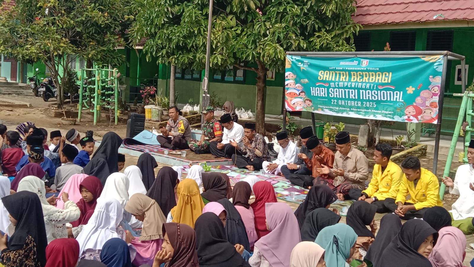 Pringsewu(ungkapkasus.id) – Dalam rangka memperingati Hari Santri Nasional 22 Oktober 2025, SDN 1 Pardasuka Timur, Kecamatan Pardasuka, Kabupaten Pringsewu, menyelenggarakan kegiatan bertema “Santri Berbagi” yang sarat dengan nilai kepedulian sosial dan penguatan karakter religius. Acara ini turut dihadiri Panit Binmas Polsek Pardasuka, Aiptu Neri Afriadi, sebagai representasi Polri yang aktif mendukung kegiatan keagamaan dan pendidikan generasi muda.