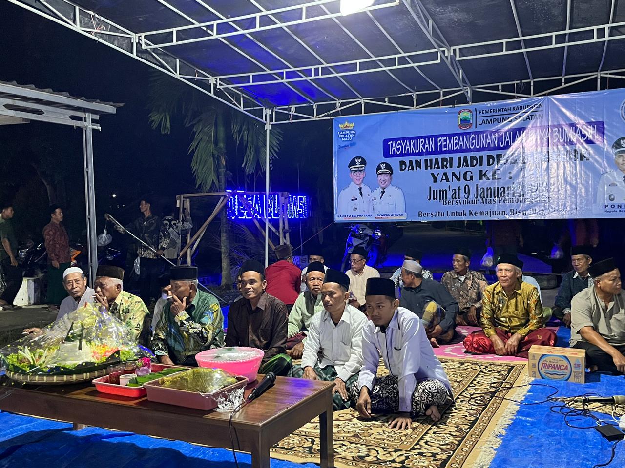 Sejak pagi, suasana gotong royong tampak kental. Warga bersama aparatur desa mendirikan tenda dan menggelar terpal secara swadaya demi kelancaran acara. Tasyukuran ini merupakan inisiatif murni masyarakat sebagai ungkapan rasa syukur atas terealisasinya pembangunan jalan poros Bumidaya–Bumi Asih–Bumirestu–Pulau Jaya–Bumi Asri hingga Trimomukti, Kecamatan Candipuro.
