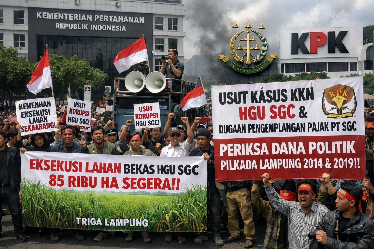 TRIGA Lampung memastikan akan menggelar aksi nasional di Jakarta pada Selasa, 3 Februari 2026. Aksi ini menargetkan langsung Kejaksaan Agung RI dan Komisi Pemberantasan Korupsi, guna mendesak penegakan hukum menyeluruh terhadap dugaan kejahatan agraria, perpajakan, suap, dan politik uang yang disebut melibatkan Sugar Group Company di Provinsi Lampung.