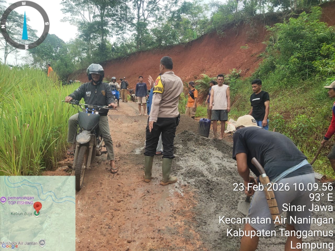 Warga Pekon Sinar Jawa, Kecamatan Air Naningan, Kabupaten Tanggamus, melaksanakan Gotong-Royong di titik jalan yang sebelumnya tertimbun material longsor. Senin, (23/2/2026).